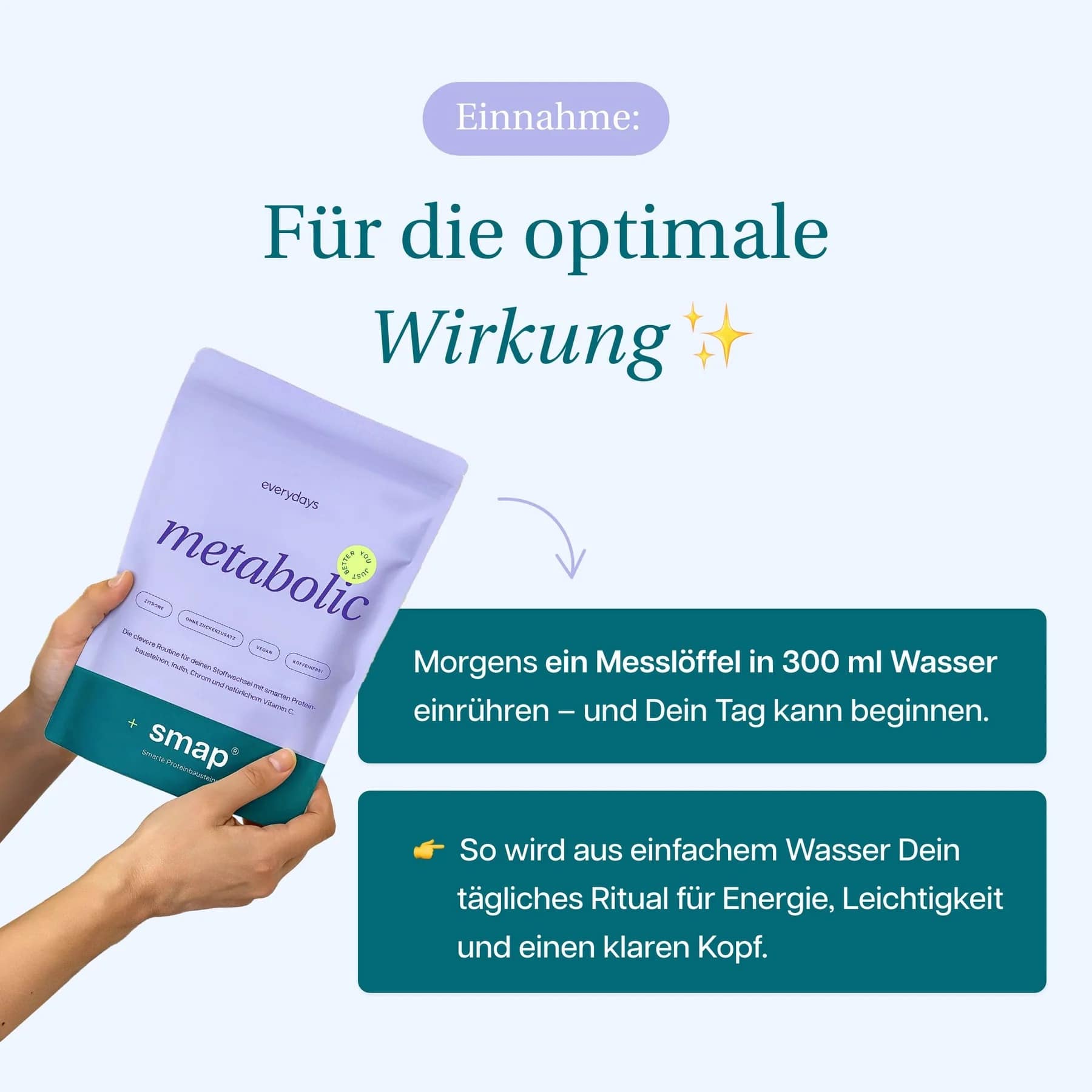 Hinweis: Um den bestmöglichen Effekt zu erzielen, sollte die Einnahme von Metabolic mit einer ausgewogenen Ernährung und einem aktiven Lebensstil kombiniert werden. Bei spezifischen gesundheitlichen Fragen konsultiere bitte einen Arzt.